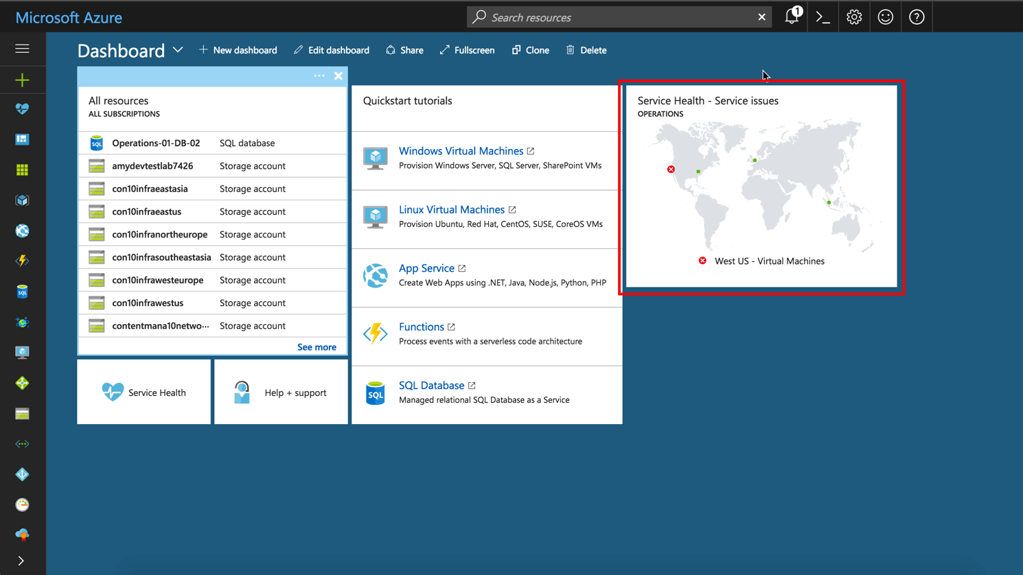 - Burada Azure üzerinde seçili olan subscriptionlarınız için tüm bölgelerde bulunan servislerin durumları ile ilgili durum haritası bulunuyor. Yeni bir alarm oluşturmak için “Create service health alert”e tıklayarak gelen ekrandan işlemlere devam ediyoruz.